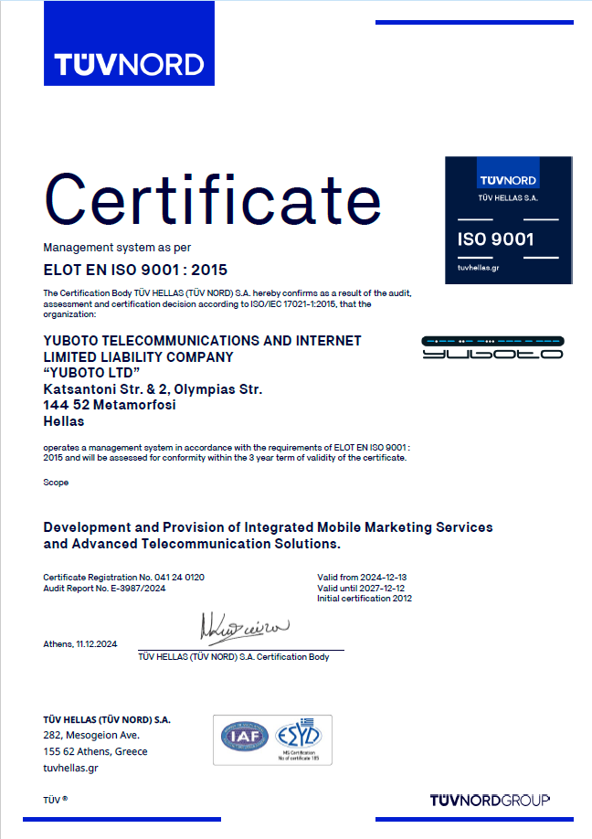 Yuboto applies a Quality Management System in accordance with ELOT EN ISO 9001:2015 covering the processes related to the company's internal operations and customer service. The Quality Management System is designed and operates as an internal organizational tool to ensure the smooth and uninterrupted operation of Yuboto's processes leading to the provision of high-quality services and therefore to the full satisfaction of its customers.